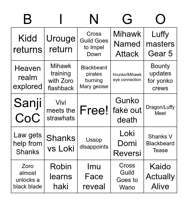 This bingo card has a free space and 24 words: Shanks vs Loki, Robin learns haki, Blackbeard pirates burning Mary geoise, Zoro almost unlocks a black blade, Luffy masters Gear 5, Kidd returns, Heaven realm explored, Urouge return, Gunko fake out death, Ussop disappoints, Imunko/Mihawk eye connection, Sanji CoC, Loki Domi Reversi, Shanks V Blackbeard Tease, Mihawk training with Zoro flashback, Cross Guild Goes to Wano, Dragon/Luffy Meet, Cross Guild Goes to Impel Down, Bounty updates for yonko crews, Vivi meets the strawhats, Kaido Actually Alive, Law gets help from Shanks, Mihawk Named Attack and Imu Face reveal.