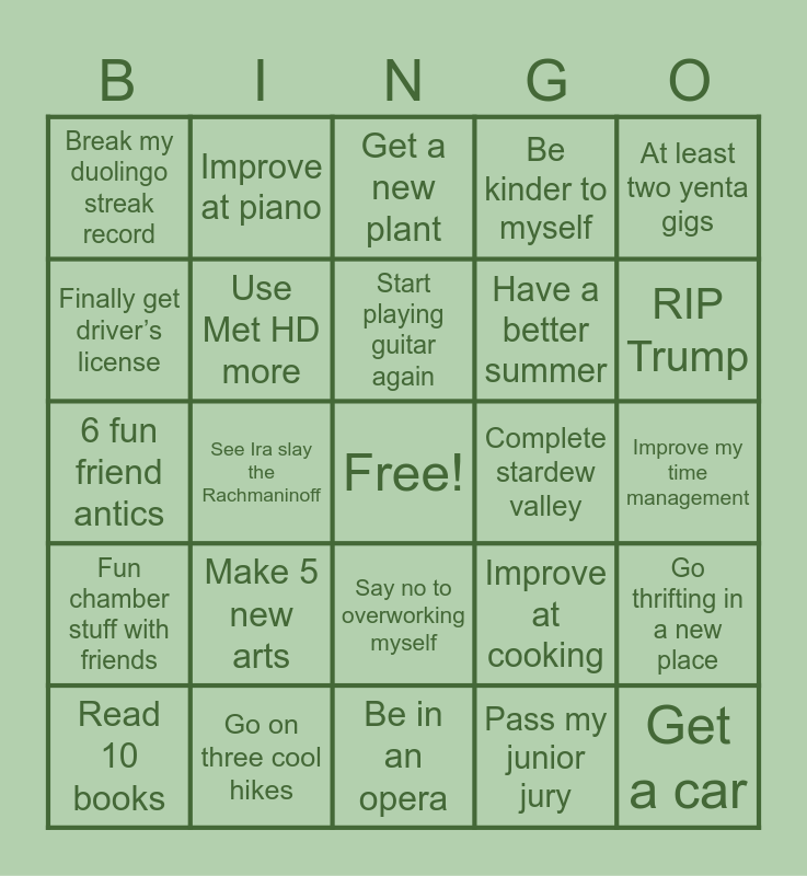 This bingo card has a free space and 24 words: Read 10 books, Make 5 new arts, Start playing guitar again, Pass my junior jury, At least two yenta gigs, Break my duolingo streak record, Improve at piano, Get a new plant, Complete stardew valley, Improve my time management, 6 fun friend antics, Use Met HD more, Improve at cooking, Go thrifting in a new place, Finally get driver’s license, Go on three cool hikes, Be in an opera, Be kinder to myself, RIP Trump, Fun chamber stuff with friends, See Ira slay the Rachmaninoff, Say no to overworking myself, Have a better summer and Get a car.