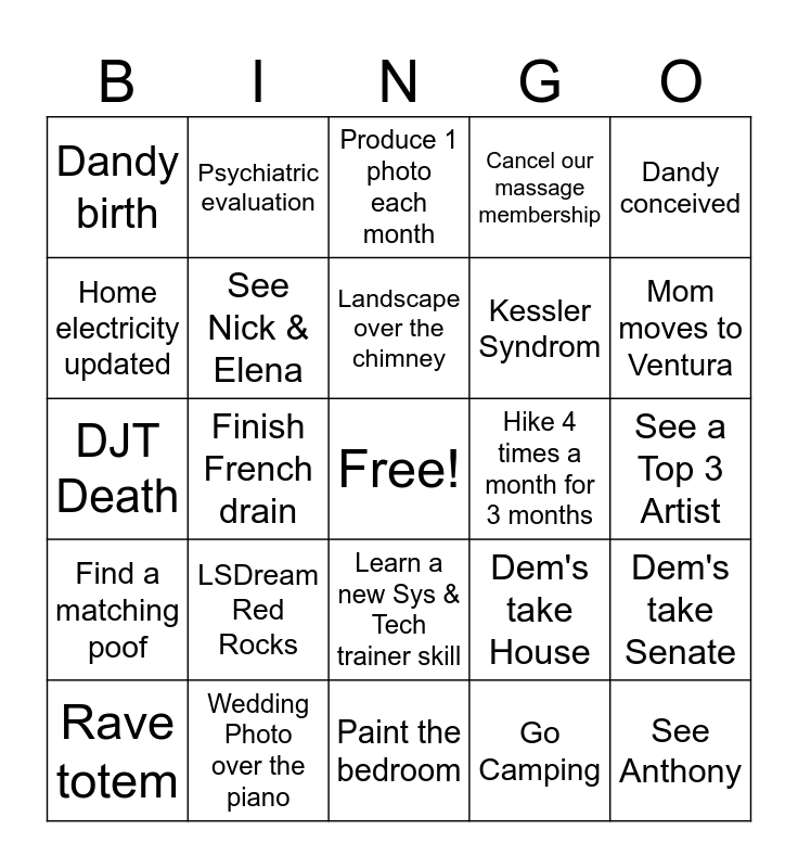 This bingo card has a free space and 24 words: LSDream Red Rocks, Wedding Photo over the piano, Landscape over the chimney, Rave totem, Dandy conceived, Dandy birth, Home electricity updated, Psychiatric evaluation, Hike 4 times a month for 3 months, Learn a new Sys & Tech trainer skill, Kessler Syndrom, DJT Death, Dem's take House, Dem's take Senate, See Nick & Elena, Go Camping, See a Top 3 Artist, Produce 1 photo each month, Mom moves to Ventura, Finish French drain, See Anthony, Find a matching poof, Cancel our massage membership and Paint the bedroom.