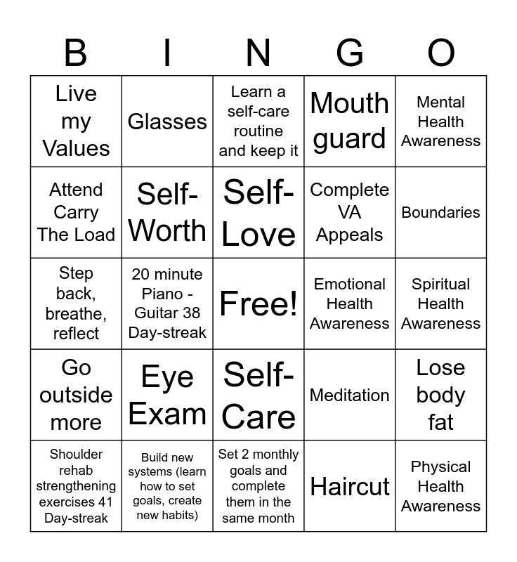 This bingo card has a free space and 24 words: Eye Exam, Build new systems (learn how to set goals, create new habits), Self-Love, Shoulder rehab strengthening exercises 41 Day-streak, Mental Health Awareness, Live my Values, Attend Carry The Load, Glasses, Emotional Health Awareness, Self-Care, Complete VA Appeals, Step back, breathe, reflect, Meditation, Lose body fat, Self-Worth, Haircut, Spiritual Health Awareness, Learn a self-care routine and keep it, Boundaries, 20 minute Piano - Guitar 38 Day-streak, Physical Health Awareness, Go outside more, Mouth guard and Set 2 monthly goals and complete them in the same month.