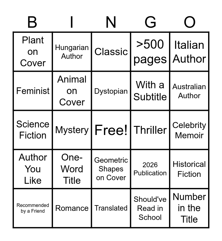 This bingo card has a free space and 24 words: One-Word Title, Romance, Dystopian, Recommended by a Friend, Italian Author, Plant on Cover, Feminist, Hungarian Author, Thriller, Geometric Shapes on Cover, With a Subtitle, Science Fiction, 2026 Publication, Historical Fiction, Animal on Cover, Should've Read in School, Celebrity Memoir, Classic, Australian Author, Mystery, Number in the Title, Author You Like, >500 pages and Translated.