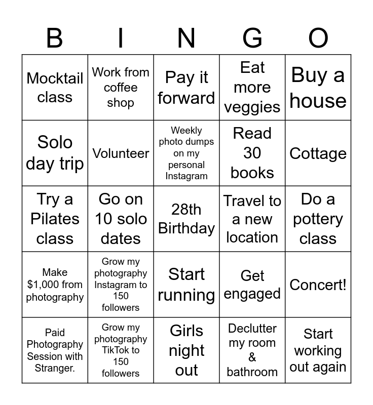 This bingo card has a free space and 24 words: Grow my photography Instagram to 150 followers, Grow my photography TikTok to 150 followers, Weekly photo dumps on my personal Instagram, Paid Photography Session with Stranger., Buy a house, Mocktail class, Solo day trip, Work from coffee shop, Travel to a new location, Start running, Read 30 books, Try a Pilates class, Get engaged, Concert!, Volunteer, Declutter my room & bathroom, Do a pottery class, Pay it forward, Cottage, Go on 10 solo dates, Start working out again, Make $1,000 from photography, Eat more veggies and Girls night out.