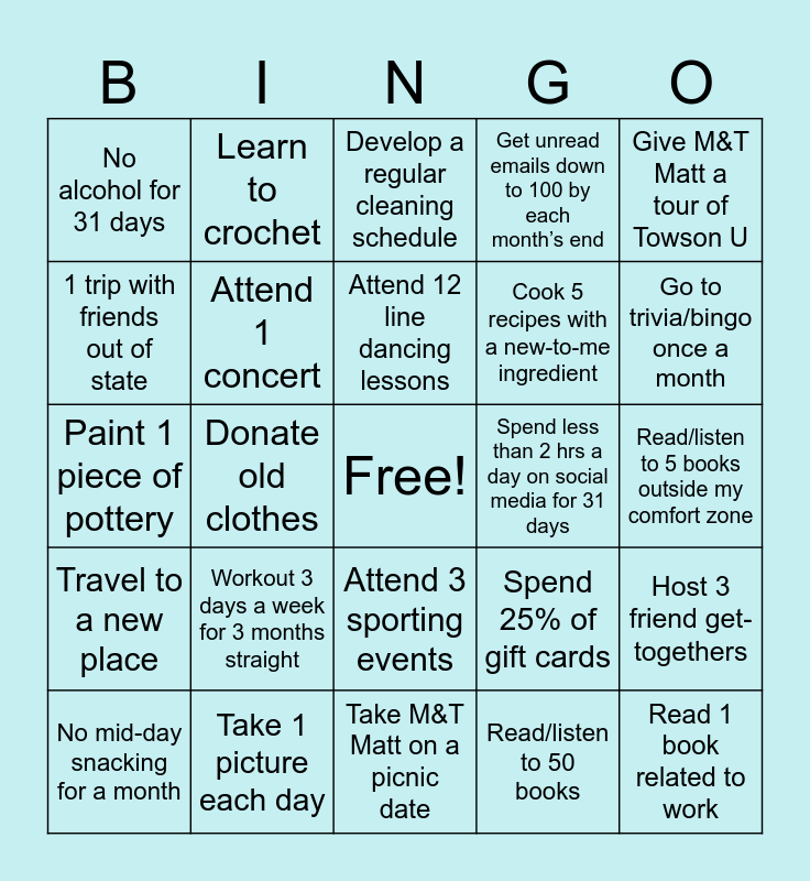 This bingo card has a free space and 24 words: Workout 3 days a week for 3 months straight, Take 1 picture each day, Attend 12 line dancing lessons, No mid-day snacking for a month, Give M&T Matt a tour of Towson U, No alcohol for 31 days, 1 trip with friends out of state, Learn to crochet, Spend less than 2 hrs a day on social media for 31 days, Attend 3 sporting events, Cook 5 recipes with a new-to-me ingredient, Paint 1 piece of pottery, Spend 25% of gift cards, Host 3 friend get-togethers, Attend 1 concert, Read/listen to 50 books, Read/listen to 5 books outside my comfort zone, Develop a regular cleaning schedule, Go to trivia/bingo once a month, Donate old clothes, Read 1 book related to work, Travel to a new place, Get unread emails down to 100 by each month’s end and Take M&T Matt on a picnic date.