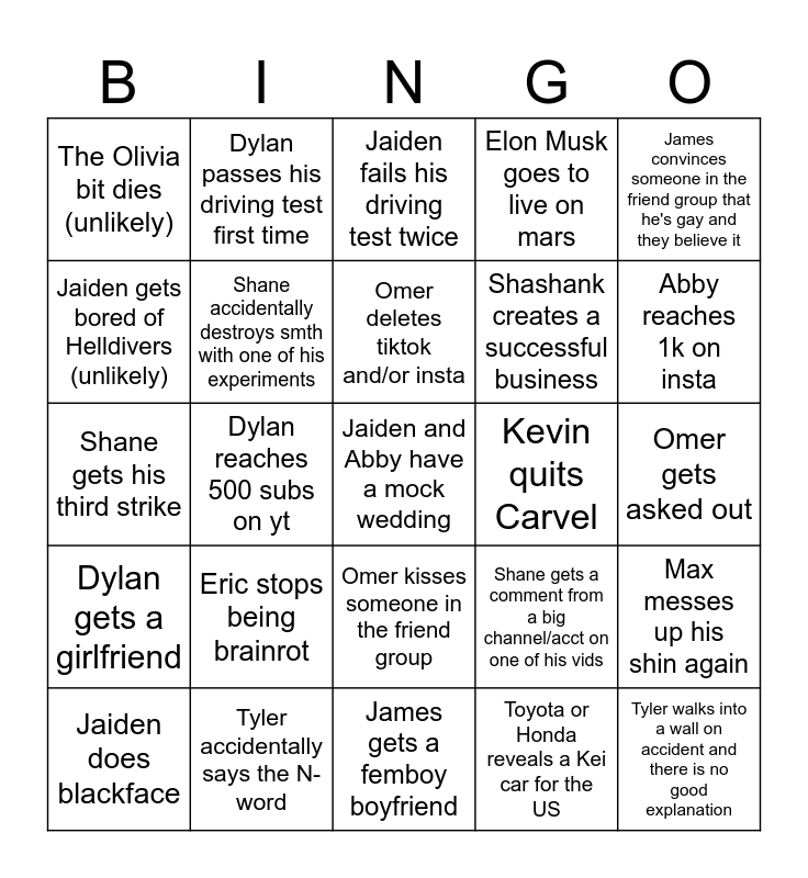 This bingo card has 25 words: Dylan gets a girlfriend, Tyler accidentally says the N-word, Jaiden and Abby have a mock wedding, Toyota or Honda reveals a Kei car for the US, James convinces someone in the friend group that he's gay and they believe it, The Olivia bit dies (unlikely), Dylan passes his driving test first time, Jaiden fails his driving test twice, Kevin quits Carvel, Max messes up his shin again, Jaiden gets bored of Helldivers (unlikely), Shane accidentally destroys smth with one of his experiments, James gets a femboy boyfriend, Shane gets a comment from a big channel/acct on one of his vids, Abby reaches 1k on insta, Jaiden does blackface, Dylan reaches 500 subs on yt, Omer deletes tiktok and/or insta, Shashank creates a successful business, Omer gets asked out, Shane gets his third strike, Eric stops being brainrot, Omer kisses someone in the friend group, Elon Musk goes to live on mars and Tyler walks into a wall on accident and there is no good explanation.