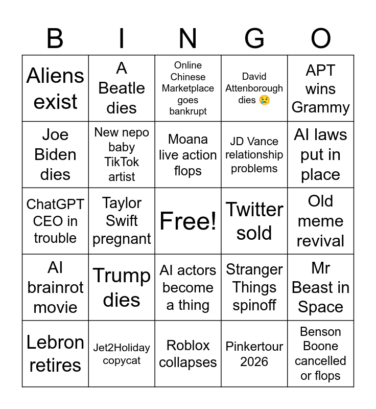 This bingo card has a free space and 24 words: Trump dies, Jet2Holiday copycat, Moana live action flops, Lebron retires, APT wins Grammy, Aliens exist, Joe Biden dies, A Beatle dies, Twitter sold, AI actors become a thing, JD Vance relationship problems, ChatGPT CEO in trouble, Stranger Things spinoff, Mr Beast in Space, New nepo baby TikTok artist, Pinkertour 2026, Old meme revival, Online Chinese Marketplace goes bankrupt, AI laws put in place, Taylor Swift pregnant, Benson Boone cancelled or flops, AI brainrot movie, David Attenborough dies 😢 and Roblox collapses.