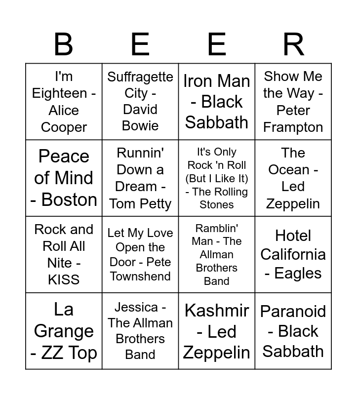 This bingo card has 29 words: Good Times Roll - The Cars, Heartbreaker - Led Zeppelin, Hotel California - Eagles, I Can't Explain - The Who, I'm Eighteen - Alice Cooper, Iron Man - Black Sabbath, It's Only Rock 'n Roll (But I Like It) - The Rolling Stones, Jeremy - Pearl Jam, Jessica - The Allman Brothers Band, Jumpin' Jack Flash - The Rolling Stones, Kashmir - Led Zeppelin, La Grange - ZZ Top, Layla - Derek and the Dominos, Life's Been Good - Joe Walsh, Let My Love Open the Door - Pete Townshend, Mary Janes Last Dance - Tom Petty, Magic Carpet Ride - Steppenwolf, Paranoid - Black Sabbath, Peace of Mind - Boston, Ramblin' Man - The Allman Brothers Band, Reelin' in the Years - Steely Dan, Rock and Roll - Led Zeppelin, Rock and Roll All Nite - KISS, Runnin' Down a Dream - Tom Petty, Show Me the Way - Peter Frampton, Suffragette City - David Bowie, Take the Money and Run - Steve Miller Band, The Ocean - Led Zeppelin and Twilight Zone - Golden Earring.