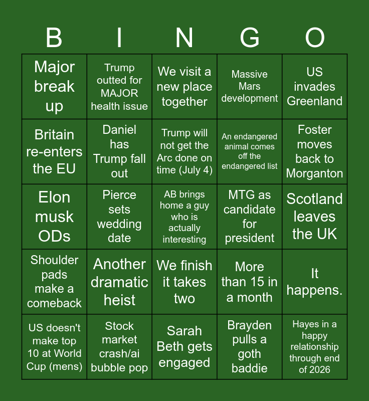 This bingo card has 30 words: Stock market crash/ai bubble pop, Someone gets engaged, Pierce sets wedding date, Someone moves out of Apex House, Major break up, We visit a new place together, Daniel has Trump fall out, We finish it takes two, MTG as candidate for president, Sarah Beth gets engaged, Scotland leaves the UK, AB brings home a guy who is actually interesting, Brayden pulls a goth baddie, Hayes in a happy relationship through end of 2026, Foster moves back to Morganton, A snow storm in Apex/Cary, More than 15 in a month, Shoulder pads make a comeback, Another dramatic heist, US invades Greenland, Elon musk ODs, JD Vance cheating scandal/divorce, Trump outted for MAJOR health issue, An endangered animal comes off the endangered list, Britain re-enters the EU, Massive Mars development, It happens., US doesn't make top 10 at World Cup (mens), Trump will not get the Arc done on time (July 4) and US invades Venezuela.