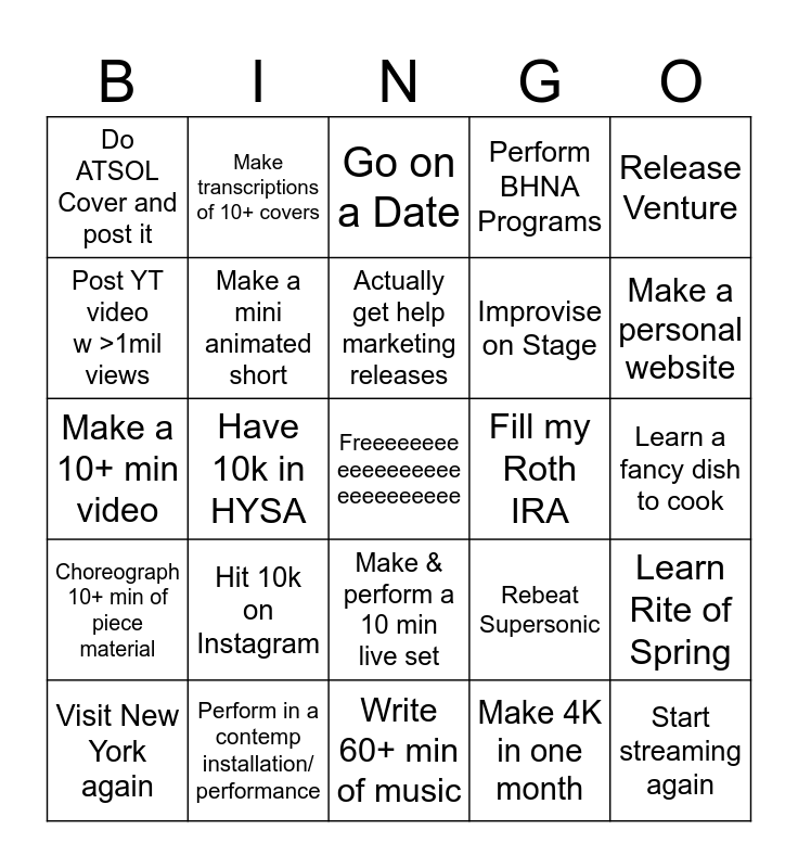This bingo card has a free space and 24 words: Hit 10k on Instagram, Perform in a contemp installation/ performance, Actually get help marketing releases, Visit New York again, Release Venture, Do ATSOL Cover and post it, Post YT video w >1mil views, Make transcriptions of 10+ covers, Fill my Roth IRA, Make & perform a 10 min live set, Improvise on Stage, Make a 10+ min video, Rebeat Supersonic, Learn Rite of Spring, Make a mini animated short, Make 4K in one month, Learn a fancy dish to cook, Go on a Date, Make a personal website, Have 10k in HYSA, Start streaming again, Choreograph 10+ min of piece material, Perform BHNA Programs and Write 60+ min of music.