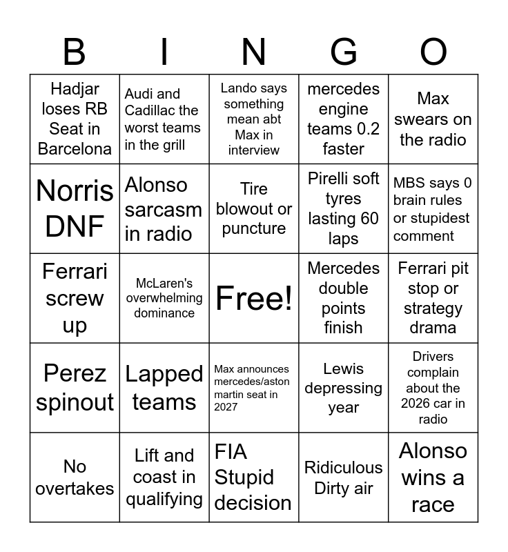 This bingo card has a free space and 24 words: No overtakes, Lapped teams, Tire blowout or puncture, Ridiculous Dirty air, Max swears on the radio, Hadjar loses RB Seat in Barcelona, Audi and Cadillac the worst teams in the grill, Lando says something mean abt Max in interview, Mercedes double points finish, Ferrari pit stop or strategy drama, Ferrari screw up, Alonso sarcasm in radio, Lewis depressing year, Drivers complain about the 2026 car in radio, Norris DNF, Lift and coast in qualifying, FIA Stupid decision, mercedes engine teams 0.2 faster, MBS says 0 brain rules or stupidest comment, Perez spinout, McLaren's overwhelming dominance, Max announces mercedes/aston martin seat in 2027, Pirelli soft tyres lasting 60 laps and Alonso wins a race.