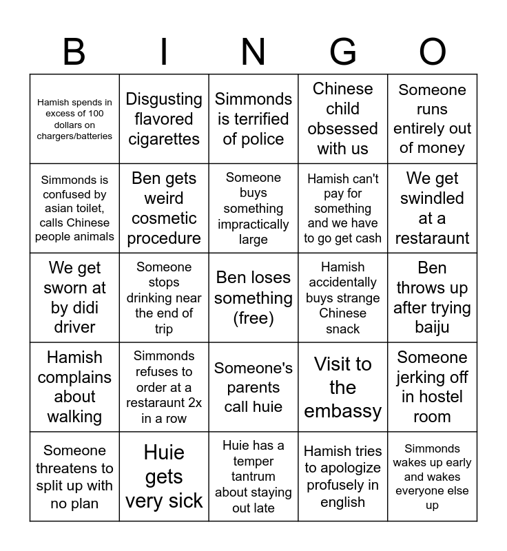 This bingo card has a free space and 24 words: Simmonds refuses to order at a restaraunt 2x in a row, Huie gets very sick, Someone buys something impractically large, Someone threatens to split up with no plan, Someone runs entirely out of money, Hamish spends in excess of 100 dollars on chargers/batteries, Simmonds is confused by asian toilet, calls Chinese people animals, Disgusting flavored cigarettes, Hamish accidentally buys strange Chinese snack, Someone's parents call huie, Hamish can't pay for something and we have to go get cash, We get sworn at by didi driver, Visit to the embassy, Someone jerking off in hostel room, Ben gets weird cosmetic procedure, Hamish tries to apologize profusely in english, Ben throws up after trying baiju, Simmonds is terrified of police, We get swindled at a restaraunt, Someone stops drinking near the end of trip, Simmonds wakes up early and wakes everyone else up, Hamish complains about walking, Chinese child obsessed with us and Huie has a temper tantrum about staying out late.