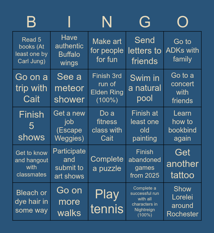 This bingo card has a free space and 24 words: Participate and submit to art shows, Go on more walks, Finish 3rd run of Elden Ring (100%), Bleach or dye hair in some way, Go to ADKs with family, Read 5 books (At least one by Carl Jung), Go on a trip with Cait, Have authentic Buffalo wings, Finish at least one old painting, Complete a puzzle, Swim in a natural pool, Finish 5 shows, Finish abandoned games from 2025, Get another tattoo, See a meteor shower, Complete a successful run with all characters in Nightreign (100%), Learn how to bookbind again, Make art for people for fun, Go to a concert with friends, Get a new job (Escape Weggies), Show Lorelei around Rochester, Get to know and hangout with classmates, Send letters to friends and Play tennis.