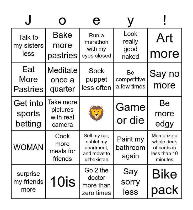 This bingo card has a free space and 24 words: Cook more meals for friends, 10is, Sock puppet less often, surprise my friends more, Art more, Talk to my sisters less, Eat More Pastries, Bake more pastries, Game or die, Sell my car, sublet my apartment, and move to uzbekistan, Be competitive a few times, Get into sports betting, Paint my bathroom again, Memorize a whole deck of cards in less than 10 minutes, Meditate once a quarter, Say sorry less, Be more edgy, Run a marathon with my eyes closed, Say no more, Take more pictures with real camera, Bike pack, WOMAN, Look really good naked and Go 2 the doctor more than zero times.