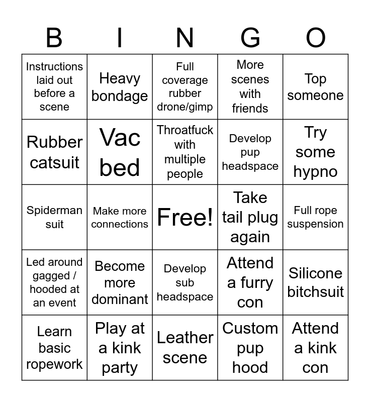This bingo card has a free space and 24 words: Become more dominant, Play at a kink party, Throatfuck with multiple people, Learn basic ropework, Top someone, Instructions laid out before a scene, Rubber catsuit, Heavy bondage, Take tail plug again, Develop sub headspace, Develop pup headspace, Spiderman suit, Attend a furry con, Silicone bitchsuit, Vac bed, Custom pup hood, Full rope suspension, Full coverage rubber drone/gimp, Try some hypno, Make more connections, Attend a kink con, Led around gagged / hooded at an event, More scenes with friends and Leather scene.