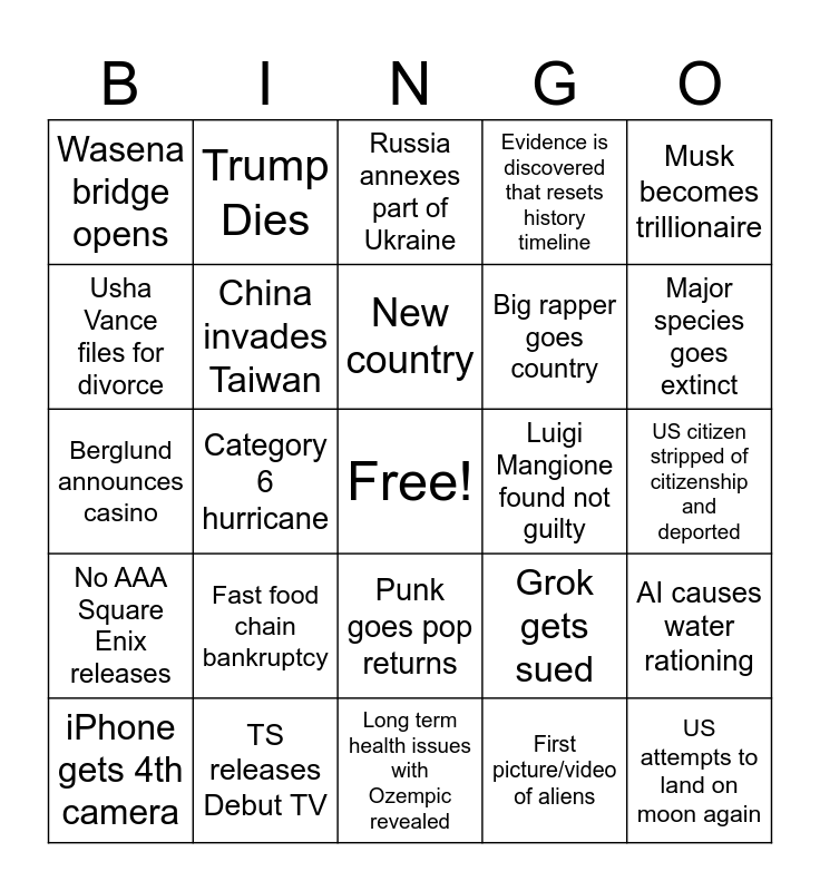 This bingo card has a free space and 24 words: Fast food chain bankruptcy, TS releases Debut TV, New country, iPhone gets 4th camera, Musk becomes trillionaire, Wasena bridge opens, Usha Vance files for divorce, Trump Dies, Luigi Mangione found not guilty, Punk goes pop returns, Big rapper goes country, Berglund announces casino, Grok gets sued, AI causes water rationing, China invades Taiwan, First picture/video of aliens, US citizen stripped of citizenship and deported, Russia annexes part of Ukraine, Major species goes extinct, Category 6 hurricane, US attempts to land on moon again, No AAA Square Enix releases, Evidence is discovered that resets history timeline and Long term health issues with Ozempic revealed.
