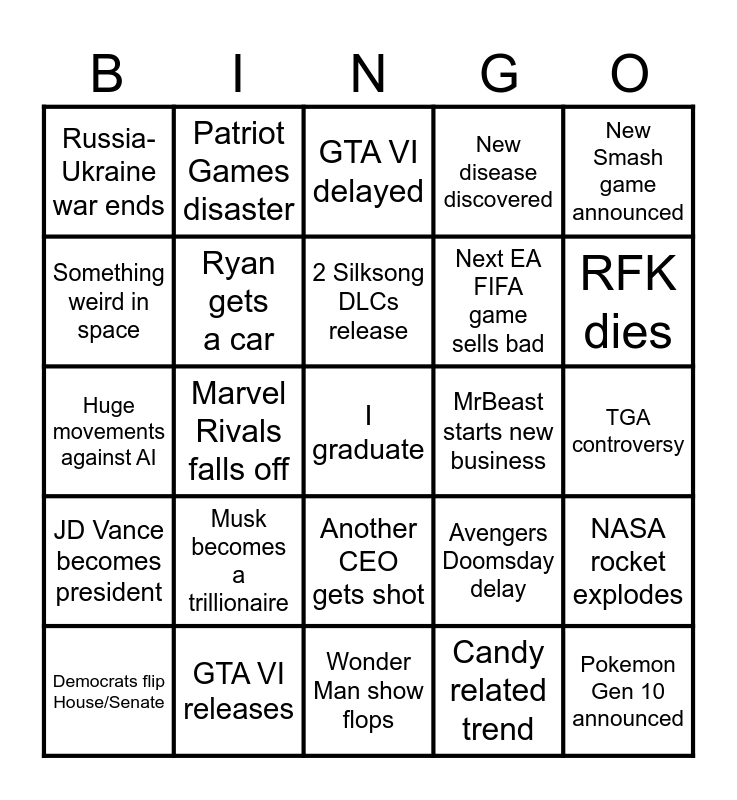 This bingo card has a free space and 24 words: Musk becomes a trillionaire, GTA VI releases, 2 Silksong DLCs release, Democrats flip House/Senate, New Smash game announced, Russia-Ukraine war ends, Something weird in space, Patriot Games disaster, MrBeast starts new business, Another CEO gets shot, Next EA FIFA game sells bad, Huge movements against AI, Avengers Doomsday delay, NASA rocket explodes, Ryan gets a car, Candy related trend, TGA controversy, GTA VI delayed, RFK dies, Marvel Rivals falls off, Pokemon Gen 10 announced, JD Vance becomes president, New disease discovered and Wonder Man show flops.