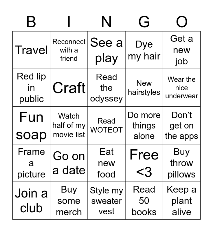 This bingo card has 25 words: Go on a date, Style my sweater vest, Read the odyssey, Join a club, Get a new job, Travel, Red lip in public, Reconnect with a friend, Do more things alone, Eat new food, New hairstyles, Fun soap, Free <3, Buy throw pillows, Craft, Keep a plant alive, Don’t get on the apps, See a play, Wear the nice underwear, Watch half of my movie list, Read WOTEOT, Buy some merch, Frame a picture, Dye my hair and Read 50 books.