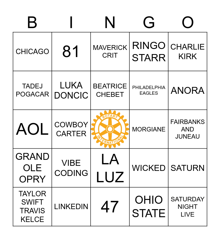 This bingo card has a free space and 50 words: 99 MINUTES, SATURDAY NIGHT LIVE, BEYONCE, 47, VIBE CODING, ROBERT REDFORD, 81, BRIAN WILSON, TADEJ POGACAR, CAMP MYSTIC, LUKA DONCIC, RINGO STARR, SATURN, WICKED, STRANGER THINGS, OKLAHOMA CITY, BEATRICE CHEBET, MORGIANE, 43, CHARLIE KIRK, COWBOY CARTER, OHIO STATE, CHICAGO, PHILADELPHIA EAGLES, LA DODGERS, OKC THUNDER, ANORA, ESPN GAMEDAY, MAVERICK CRIT, LA LUZ, STORYPALOOZA, CARTER AND MICHAEL, AFGHANISTAN PAKISTAN, CALGARY, LINKEDIN, 9 MONTHS, EDWARD R MURROW, SHOELESS JOE JACKSON PETE ROSE, ECLAIRCISSEMENT, FAIRBANKS AND JUNEAU, VOGUE, MARGARITA, INDIA, JEN PAWOL, TAYLOR SWIFT TRAVIS KELCE, AOL, CONSTRUCTION WORKERS, US PENNY, GRAND OLE OPRY and 67.