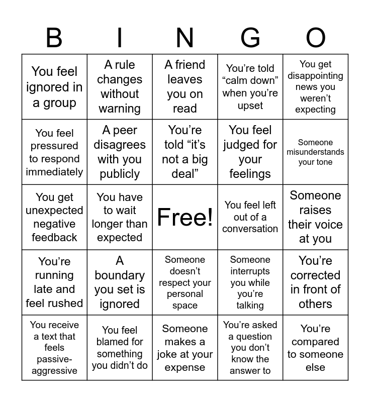 This bingo card has a free space and 27 words: Someone interrupts you while you’re talking, You make a mistake in front of others, You feel judged for your feelings, Someone makes a joke at your expense, You feel pressured to respond immediately, A friend leaves you on read, A rule changes without warning, You’re running late and feel rushed, You feel left out of a conversation, You’re corrected in front of others, You get unexpected negative feedback, You’re told “calm down” when you’re upset, You receive a text that feels passive-aggressive, You feel blamed for something you didn’t do, Someone misunderstands your tone, You don’t get credit for your effort, A peer disagrees with you publicly, You’re told “it’s not a big deal”, A boundary you set is ignored, You feel ignored in a group, Someone raises their voice at you, You’re asked a question you don’t know the answer to, You have to wait longer than expected, You’re compared to someone else, Someone doesn’t respect your personal space, You get disappointing news you weren’t expecting and Someone doesn’t respond when you ask for help.