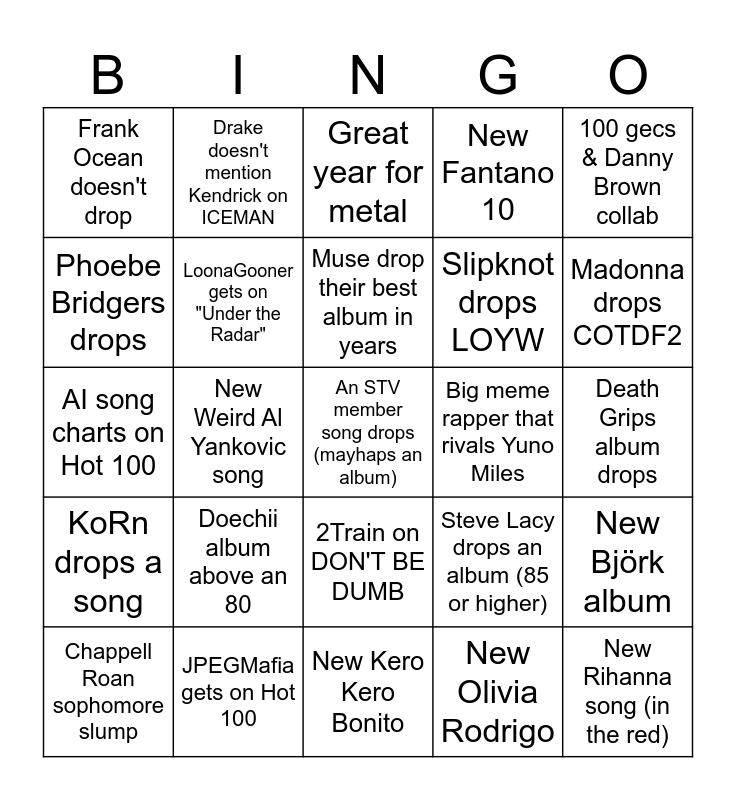 This bingo card has a free space and 24 words: Doechii album above an 80, JPEGMafia gets on Hot 100, Muse drop their best album in years, Chappell Roan sophomore slump, 100 gecs & Danny Brown collab, Frank Ocean doesn't drop, Phoebe Bridgers drops, Drake doesn't mention Kendrick on ICEMAN, Big meme rapper that rivals Yuno Miles, 2Train on DON'T BE DUMB, Slipknot drops LOYW, AI song charts on Hot 100, Steve Lacy drops an album (85 or higher), New Björk album, LoonaGooner gets on "Under the Radar", New Olivia Rodrigo, Death Grips album drops, Great year for metal, Madonna drops COTDF2, New Weird Al Yankovic song, New Rihanna song (in the red), KoRn drops a song, New Fantano 10 and New Kero Kero Bonito.