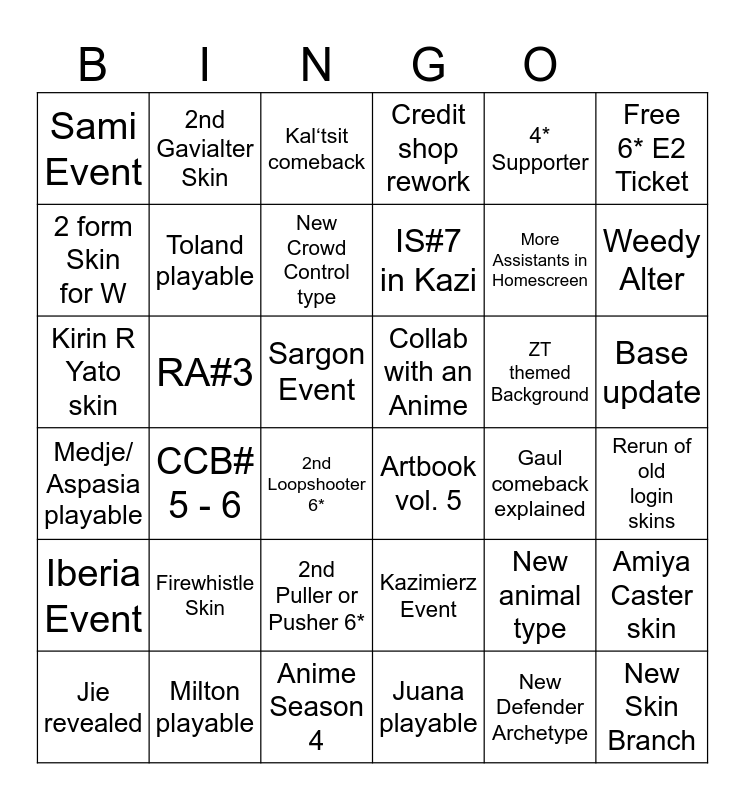 This bingo card has 36 words: Medje/ Aspasia playable, CCB# 5 - 6, Anime Season 4, IS#7 in Kazi, ZT themed Background, Base update, Sami Event, Milton playable, Kal‘tsit comeback, Kazimierz Event, More Assistants in Homescreen, Free 6* E2 Ticket, Iberia Event, RA#3, New Crowd Control type, Credit shop rework, New animal type, Rerun of old login skins, 2 form Skin for W, Toland playable, 2nd Loopshooter 6*, Artbook vol. 5, Gaul comeback explained, Amiya Caster skin, Kirin R Yato skin, 2nd Gavialter Skin, Sargon Event, Juana playable, 4* Supporter, Weedy Alter, Jie revealed, Firewhistle Skin, 2nd Puller or Pusher 6*, Collab with an Anime, New Defender Archetype and New Skin Branch.