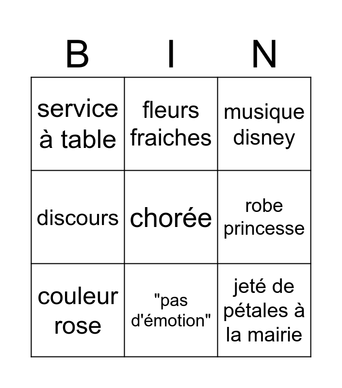 This bingo card has a free space and 8 words: robe princesse, musique disney, fleurs fraiches, couleur rose, service à table, jeté de pétales à la mairie, discours and "pas d'émotion".