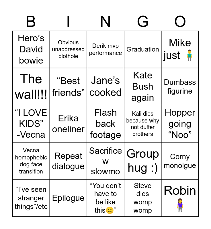 This bingo card has a free space and 24 words: Repeat dialogue, Epilogue, Jane’s cooked, “I’ve seen stranger things”/etc, Mike just 🧍♂️, Hero’s David bowie, The wall!!!, Obvious unaddressed plothole, Kali dies because why not duffer brothers, Sacrifice w slowmo, Kate Bush again, “I LOVE KIDS” -Vecna, Group hug :), Corny monolgue, “Best friends”, Steve dies womp womp, Hopper going “Noo”, Derik mvp performance, Dumbass figurine, Erika oneliner, Robin🧍♀️, Vecna homophobic dog face transition, Graduation and “You don’t have to be like this☹️”.