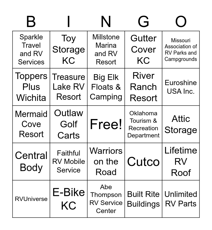 This bingo card has a free space and 38 words: Fireside Goodies, Second Chance Pet Adoptions, Royal RV Repair, Treasure Lake RV Resort, Lifetime RV Roof, Faithful RV Mobile Service, Big Elk Floats & Camping, Arven RV Oven Heat Diffuser, Missouri Association of RV Parks and Campgrounds, River Ranch Resort, Outlaw Golf Carts, Gutter Cover KC, Unlimited RV Parts, Attic Storage, Toppers Plus Wichita, Central Body, Superior Sleep Experience, Millstone Marina and RV Resort, Missouri State Parks, Oklahoma Tourism & Recreation Department, Sparkle Travel and RV Services, E-Bike KC, Euroshine USA Inc., RVUniverse, Travel Easy Decks Midwest, Abe Thompson RV Service Center, Epic RV Merch, Cedar Creek Resort & RV Park, Camp Moix, Madd House Hill, My Massage Pillow, Warriors on the Road, Built Rite Buildings, Toy Storage KC, Geotrek Vans, Cutco, Mermaid Cove Resort and Grandma Irma Sauces.