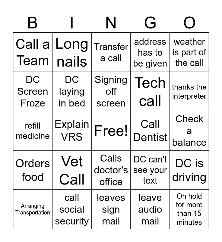 This bingo card has a free space and 29 words: Arranging Transportation, Personalized Greeting, Explain VRS, VCO, Call a Team, Transfer a call, DC laying in bed, Vet Call, Call Dentist, call social security, Check a balance, On hold for more than 15 minutes, leaves sign mail, leave audio mail, thanks the interpreter, call the cable company, Calls doctor's office, Orders food, weather is part of the call, refill medicine, DC can't see your text, says I love you, Tech call, DC Screen Froze, address has to be given, Long nails, DC is driving, Signing off screen and Insurance call.