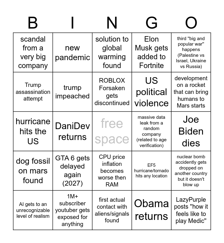 This bingo card has a free space and 24 words: GTA 6 gets delayed again (2027), 1M+ subscriber youtuber gets exposed for anything, ROBLOX Forsaken gets discontinued, AI gets to an unrecognizable level of realism, third ''big and popular war'' happens (Palestine vs Israel, Ukraine vs Russia), scandal from a very big company, Trump assassination attempt, new pandemic, massive data leak from a random company (related to age verification), CPU price inflation becomes worse then RAM, US political violence, hurricane hits the US, EF5 hurricane/tornado hits any location, nuclear bomb accidently gets dropped on another country but it doesn't blow up, trump impeached, Obama returns, Joe Biden dies, solution to global warming found, development on a rocket that can bring humans to Mars starts, DaniDev returns, LazyPurple posts ''how it feels like to play Medic'', dog fossil on mars found, Elon Musk gets added to Fortnite and first actual contact with aliens/signals found.