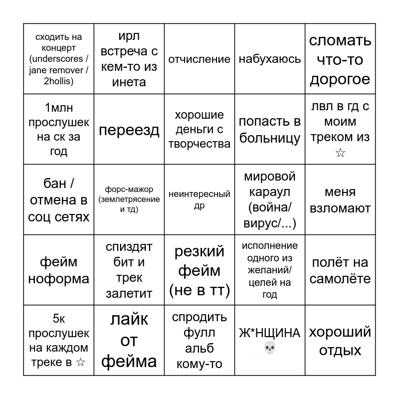This bingo card has 25 words: спиздят бит и трек залетит, спродить фулл альб кому-то, хорошие деньги с творчества, 5к прослушек на каждом треке в ☆, сломать что-то дорогое, сходить на концерт (underscores / jane remover / 2hollis), 1млн прослушек на ск за год, ирл встреча с кем-то из инета, мировой караул (война/вирус/...), резкий фейм (не в тт), попасть в больницу, бан /отмена в соц сетях, исполнение одного из желаний/целей на год, полёт на самолёте, переезд, хороший отдых, меня взломают, отчисление, лвл в гд с моим треком из ☆, форс-мажор (землетрясение и тд), неинтересный др, лайк от фейма, фейм ноформа, набухаюсь and Ж*НЩИНА💀.