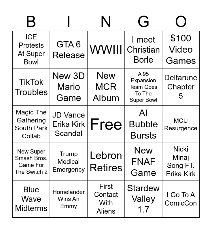 This bingo card has a free space and 24 words: Trump Medical Emergency, Homelander Wins An Emmy, New MCR Album, Blue Wave Midterms, $100 Video Games, ICE Protests At Super Bowl, TikTok Troubles, GTA 6 Release, AI Bubble Bursts, Lebron Retires, A 95 Expansion Team Goes To The Super Bowl, Magic The Gathering South Park Collab, New FNAF Game, Nicki Minaj Song FT. Erika Kirk, New 3D Mario Game, Stardew Valley 1.7, MCU Resurgence, WWIII, Deltarune Chapter 5, JD Vance Erika Kirk Scandal, I Go To A ComicCon, New Super Smash Bros. Game For The Switch 2, I meet Christian Borle and First Contact With Aliens.
