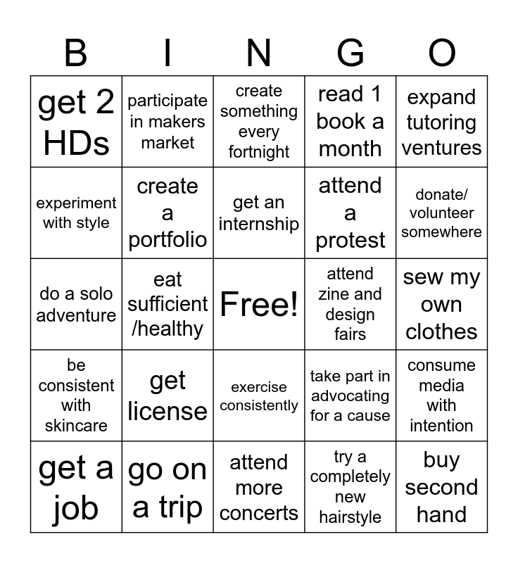 This bingo card has a free space and 24 words: get license, go on a trip, get an internship, get a job, expand tutoring ventures, get 2 HDs, experiment with style, participate in makers market, attend zine and design fairs, exercise consistently, attend a protest, do a solo adventure, take part in advocating for a cause, consume media with intention, create a portfolio, try a completely new hairstyle, sew my own clothes, create something every fortnight, donate/ volunteer somewhere, eat sufficient /healthy, buy second hand, be consistent with skincare, read 1 book a month and attend more concerts.