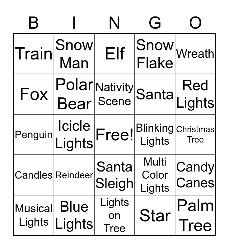 This bingo card has a free space and 24 words: Reindeer, Blue Lights, Nativity Scene, Musical Lights, Wreath, Train, Fox, Snow Man, Blinking Lights, Santa Sleigh, Santa, Penguin, Multi Color Lights, Candy Canes, Polar Bear, Star, Christmas Tree, Elf, Red Lights, Icicle Lights, Palm Tree, Candles, Snow Flake and Lights on Tree.