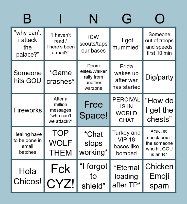 This bingo card has a free space and 24 words: Hola Chicos!, TOP WOLF THEM, Doom elites/Walker rally from another warzone, *Eternal loading after TP*, Someone out of troops and speeds first 10 min, ”why can’t i attack the palace?”, “I haven’t read / There’s been a mail?”, ICW scouts/taps our bases, PERCIVAL IS IN WORLD CHAT, “How do I get the chests”, Fireworks, *Game crashes*, Turkey and VIP 18 bases like bombed, BONUS: check box if the someone who hit GOU is an R1, Someone hits GOU, Fck CYZ!, “I forgot to shield”, “I got mummied”, Dig/party, Healing have to be done in small batches, After a million messages “who can’t we attack?”, *Chat stops working*, Frida wakes up after war has started and Chicken Emoji spam.