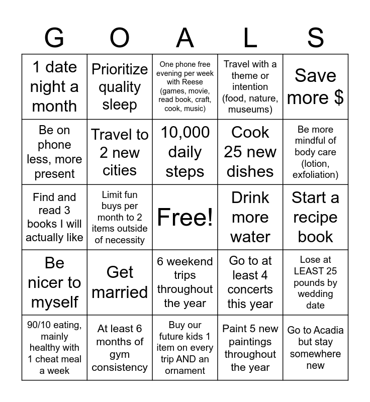 This bingo card has a free space and 24 words: Get married, At least 6 months of gym consistency, 10,000 daily steps, 90/10 eating, mainly healthy with 1 cheat meal a week, Save more $, 1 date night a month, Be on phone less, more present, Prioritize quality sleep, Drink more water, 6 weekend trips throughout the year, Cook 25 new dishes, Find and read 3 books I will actually like, Go to at least 4 concerts this year, Lose at LEAST 25 pounds by wedding date, Travel to 2 new cities, Paint 5 new paintings throughout the year, Start a recipe book, One phone free evening per week with Reese (games, movie, read book, craft, cook, music), Be more mindful of body care (lotion, exfoliation), Limit fun buys per month to 2 items outside of necessity, Go to Acadia but stay somewhere new, Be nicer to myself, Travel with a theme or intention (food, nature, museums) and Buy our future kids 1 item on every trip AND an ornament.