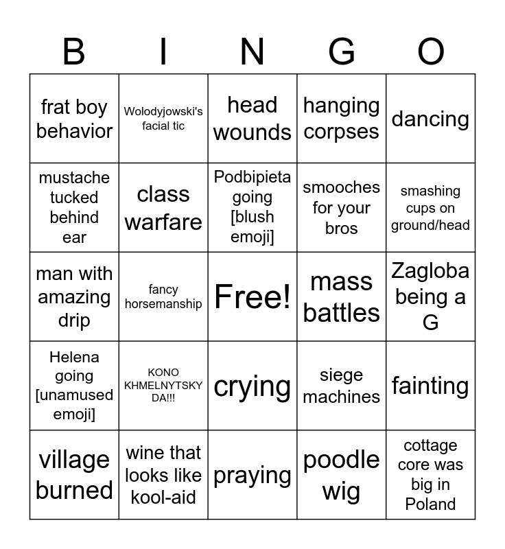 This bingo card has a free space and 24 words: KONO KHMELNYTSKY DA!!!, wine that looks like kool-aid, Podbipieta going [blush emoji], village burned, dancing, frat boy behavior, mustache tucked behind ear, Wolodyjowski's facial tic, mass battles, crying, smooches for your bros, man with amazing drip, siege machines, fainting, class warfare, poodle wig, Zagloba being a G, head wounds, smashing cups on ground/head, fancy horsemanship, cottage core was big in Poland, Helena going [unamused emoji], hanging corpses and praying.