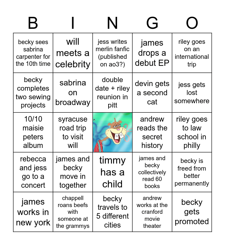 This bingo card has a free space and 24 words: james and becky move in together, chappell roans beefs with someone at the grammys, double date + riley reunion in pitt, james works in new york, riley goes on an international trip, becky sees sabrina carpenter for the 10th time, becky completes two sewing projects, will meets a celebrity, andrew reads the secret history, timmy has a child, devin gets a second cat, 10/10 maisie peters album, james and becky collectively read 60 books, becky is freed from better permanently, sabrina on broadway, andrew works at the cranford movie theater, riley goes to law school in philly, jess writes merlin fanfic (published on ao3?), jess gets lost somewhere, syracuse road trip to visit will, becky gets promoted, rebecca and jess go to a concert, james drops a debut EP and becky travels to 5 different cities.