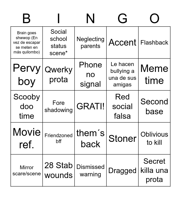 This bingo card has a free space and 24 words: Friendzoned bff, 28 Stab wounds, Phone no signal, Mirror scare/scene, Flashback, Brain goes shwwop (En vez de escapar se meten en más quilombo), Pervy boy, Social school status scene*, Red social falsa, them´s back, Le hacen bullying a una de sus amigas, Scooby doo time, Stoner, Oblivious to kill, Qwerky prota, Dragged, Second base, Neglecting parents, Meme time, Fore shadowing, Secret killa una prota, Movie ref., Accent and Dismissed warning.