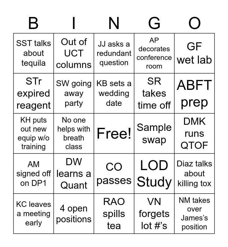 This bingo card has a free space and 24 words: DW learns a Quant, 4 open positions, KB sets a wedding date, KC leaves a meeting early, GF wet lab, SST talks about tequila, STr expired reagent, Out of UCT columns, Sample swap, CO passes, SR takes time off, KH puts out new equip w/o training, LOD Study, Diaz talks about killing tox, SW going away party, VN forgets lot #’s, DMK runs QTOF, JJ asks a redundant question, ABFT prep, No one helps with breath class, NM takes over James’s position, AM signed off on DP1, AP decorates conference room and RAO spills tea.