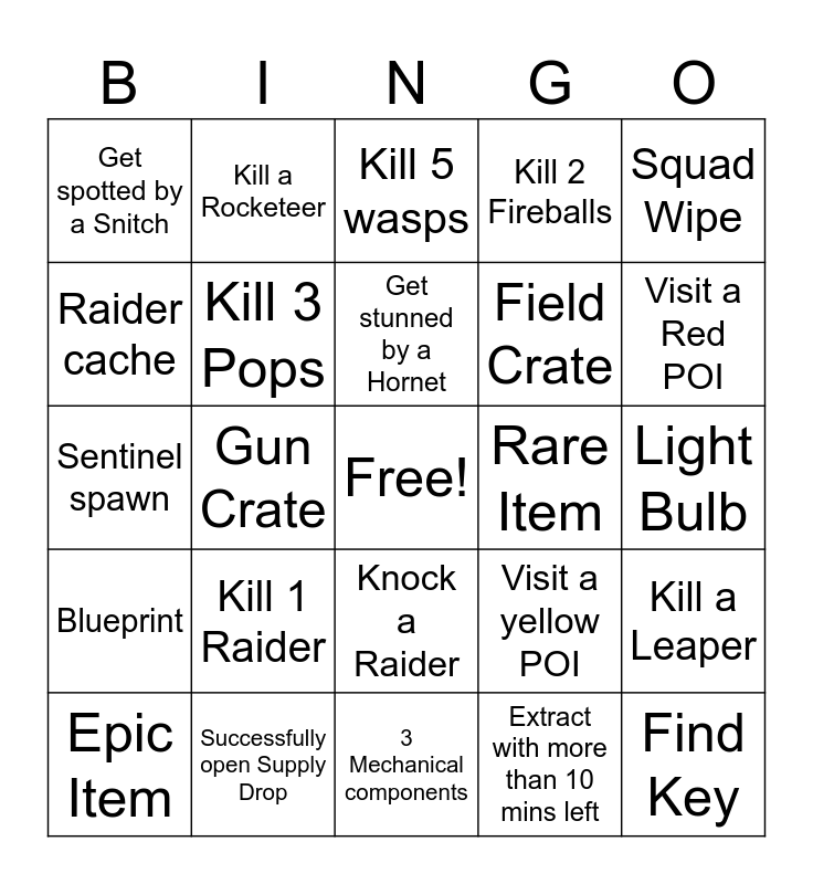 This bingo card has a free space and 29 words: Epic Item, Surveyor Kill, Gun Crate, Have a tick Jump on you, Get spotted by a Snitch, Kill 5 wasps, Kill 3 Pops, Kill 1 Raider, Rare Item, Successfully open Supply Drop, Light Bulb, Find Key, 3 Mechanical components, Extract with more than 10 mins left, Visit a Red POI, Leaper Spawn, Knock a Raider, Blueprint, Squad Wipe, Sentinel spawn, Visit a yellow POI, Befriend another Raider, Field Crate, Raider cache, Kill 2 Fireballs, Kill a Rocketeer, Kill a Leaper, Get stunned by a Hornet and Set off an Alarm.