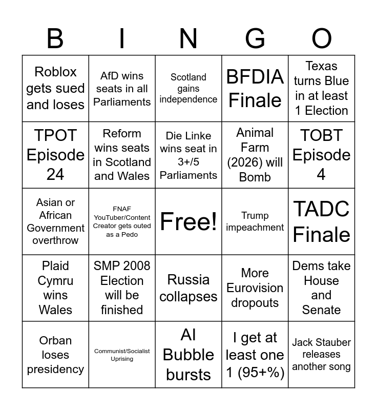 This bingo card has a free space and 24 words: SMP 2008 Election will be finished, Communist/Socialist Uprising, Die Linke wins seat in 3+/5 Parliaments, Orban loses presidency, Texas turns Blue in at least 1 Election, Roblox gets sued and loses, TPOT Episode 24, AfD wins seats in all Parliaments, Trump impeachment, Russia collapses, Animal Farm (2026) will Bomb, Asian or African Government overthrow, More Eurovision dropouts, Dems take House and Senate, Reform wins seats in Scotland and Wales, I get at least one 1 (95+%), TADC Finale, Scotland gains independence, TOBT Episode 4, FNAF YouTuber/Content Creator gets outed as a Pedo, Jack Stauber releases another song, Plaid Cymru wins Wales, BFDIA Finale and AI Bubble bursts.