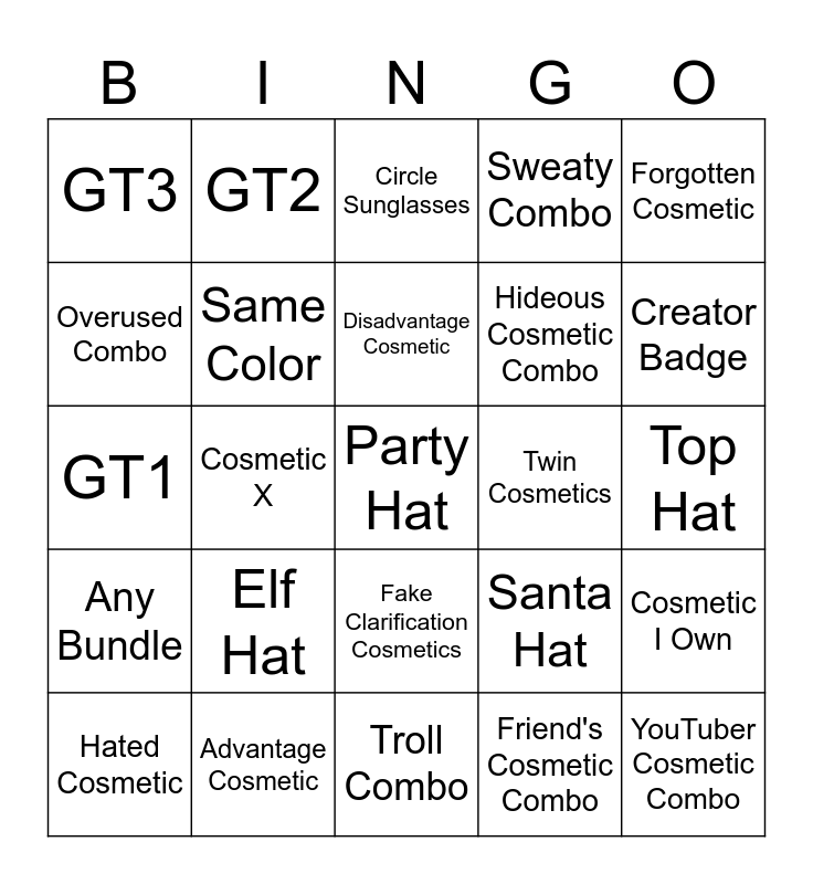 This bingo card has a free space and 24 words: Elf Hat, Advantage Cosmetic, Disadvantage Cosmetic, Hated Cosmetic, Forgotten Cosmetic, GT3, Overused Combo, GT2, Twin Cosmetics, Fake Clarification Cosmetics, Hideous Cosmetic Combo, GT1, Santa Hat, Cosmetic I Own, Same Color, Friend's Cosmetic Combo, Top Hat, Circle Sunglasses, Creator Badge, Cosmetic X, YouTuber Cosmetic Combo, Any Bundle, Sweaty Combo and Troll Combo.