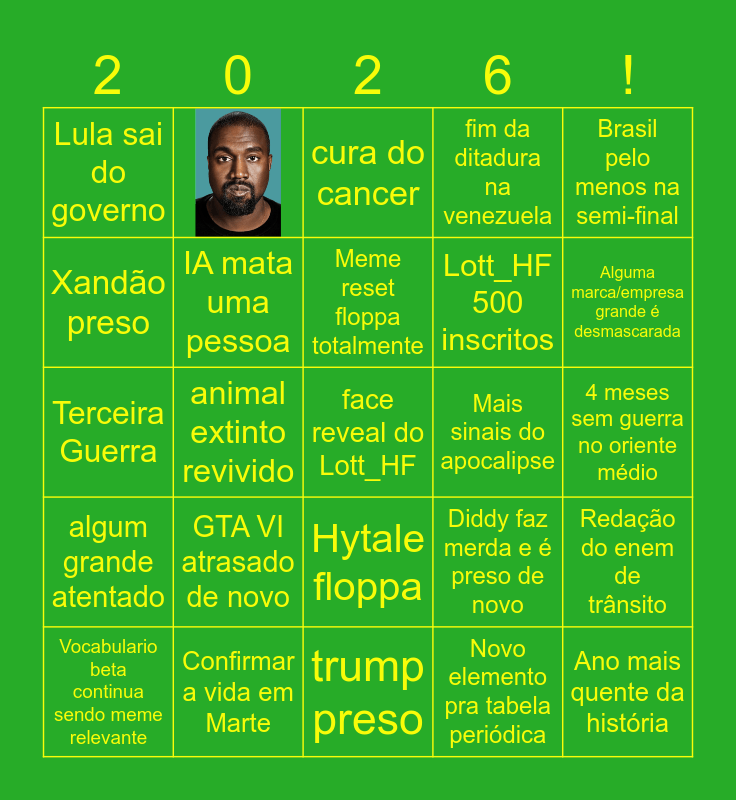 This bingo card has 1 images, a free space and 23 words: GTA VI atrasado de novo, Confirmar a vida em Marte, Meme reset floppa totalmente, Vocabulario beta continua sendo meme relevante, Brasil pelo menos na semi-final, Lula sai do governo, Xandão preso, Mais sinais do apocalipse, Hytale floppa, Lott_HF 500 inscritos, Terceira Guerra, Diddy faz merda e é preso de novo, Redação do enem de trânsito, IA mata uma pessoa, Novo elemento pra tabela periódica, 4 meses sem guerra no oriente médio, cura do cancer, Alguma marca/empresa grande é desmascarada, animal extinto revivido, Ano mais quente da história, algum grande atentado, fim da ditadura na venezuela and trump preso.