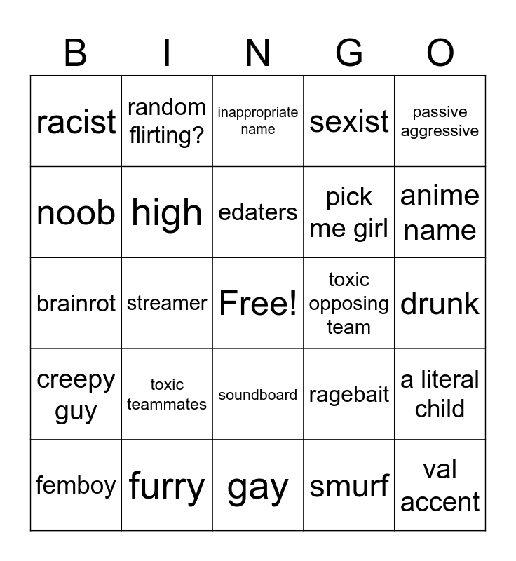 This bingo card has a free space and 24 words: toxic teammates, furry, edaters, femboy, passive aggressive, racist, noob, random flirting?, toxic opposing team, soundboard, pick me girl, brainrot, ragebait, a literal child, high, smurf, drunk, inappropriate name, anime name, streamer, val accent, creepy guy, sexist and gay.