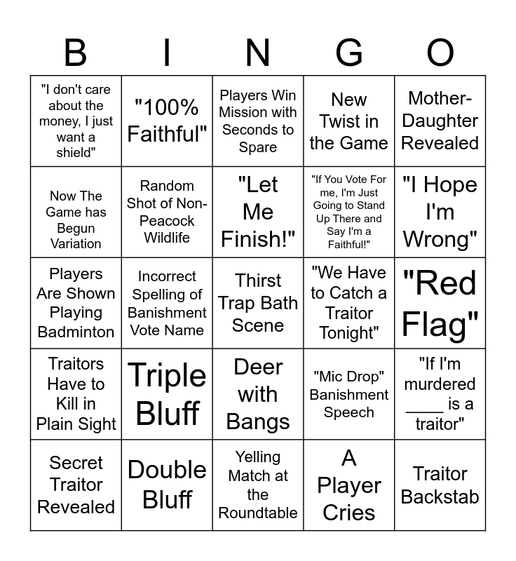 This bingo card has a free space and 24 words: Triple Bluff, Double Bluff, "Let Me Finish!", Secret Traitor Revealed, Mother-Daughter Revealed, "I don't care about the money, I just want a shield", Now The Game has Begun Variation, "100% Faithful", "We Have to Catch a Traitor Tonight", Deer with Bangs, "If You Vote For me, I'm Just Going to Stand Up There and Say I'm a Faithful!", Players Are Shown Playing Badminton, "Mic Drop" Banishment Speech, "If I'm murdered ____ is a traitor", Random Shot of Non-Peacock Wildlife, A Player Cries, "Red Flag", Players Win Mission with Seconds to Spare, "I Hope I'm Wrong", Incorrect Spelling of Banishment Vote Name, Traitor Backstab, Traitors Have to Kill in Plain Sight, New Twist in the Game and Yelling Match at the Roundtable.