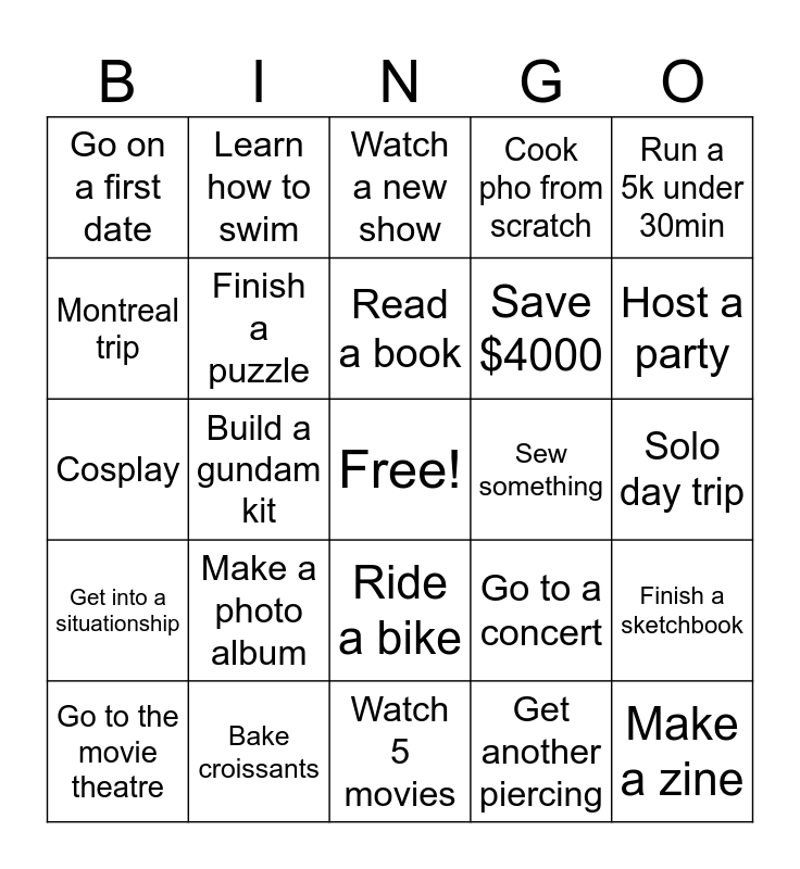 This bingo card has a free space and 24 words: Make a photo album, Bake croissants, Read a book, Go to the movie theatre, Run a 5k under 30min, Go on a first date, Montreal trip, Learn how to swim, Sew something, Ride a bike, Save $4000, Cosplay, Go to a concert, Finish a sketchbook, Finish a puzzle, Get another piercing, Solo day trip, Watch a new show, Host a party, Build a gundam kit, Make a zine, Get into a situationship, Cook pho from scratch and Watch 5 movies.