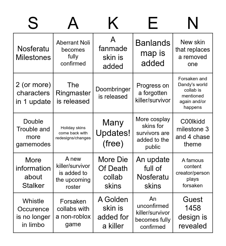 This bingo card has a free space and 24 words: A new killer/survivor is added to the upcoming roster, Forsaken collabs with a non-roblox game, Doombringer is released, Whistle Occurence is no longer in limbo, New skin that replaces a removed one, Nosferatu Milestones, 2 (or more) characters in 1 update, Aberrant Noli becomes fully confirmed, More cosplay skins for survivors are added to the public, More Die Of Death collab skins, Progress on a forgotten killer/survivor, Double Trouble and more gamemodes, An update full of Nosferatu skins, A famous content creator/person plays forsaken, The Ringmaster is released, An unconfirmed killer/survivor becomes fully confirmed, C00lkidd milestone 3 and 4 chase theme, A fanmade skin is added, Forsaken and Dandy's world collab is mentioned again and/or happens, Holiday skins come back with redesigns/changes, Guest 1458 design is revealed, More information about Stalker, Banlands map is added and A Golden skin is added for a killer.