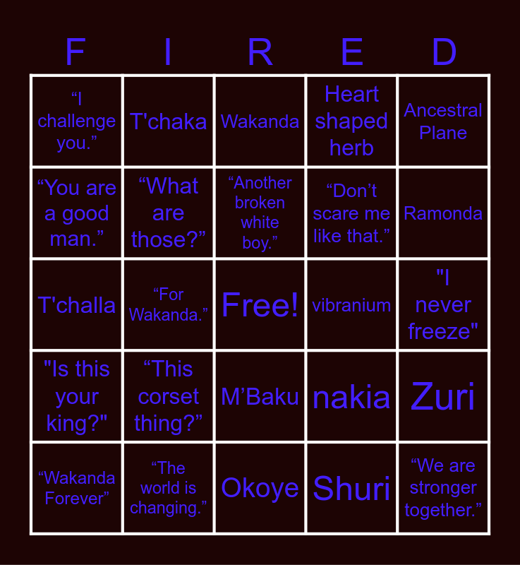 This bingo card has a free space and 24 words: “This corset thing?”, “The world is changing.”, “Another broken white boy.”, “Wakanda Forever”, Ancestral Plane, “I challenge you.”, “You are a good man.”, T'chaka, vibranium, M’Baku, “Don’t scare me like that.”, T'challa, nakia, Zuri, “What are those?”, Shuri, "I never freeze", Wakanda, Ramonda, “For Wakanda.”, “We are stronger together.”, "Is this your king?", Heart shaped herb and Okoye.