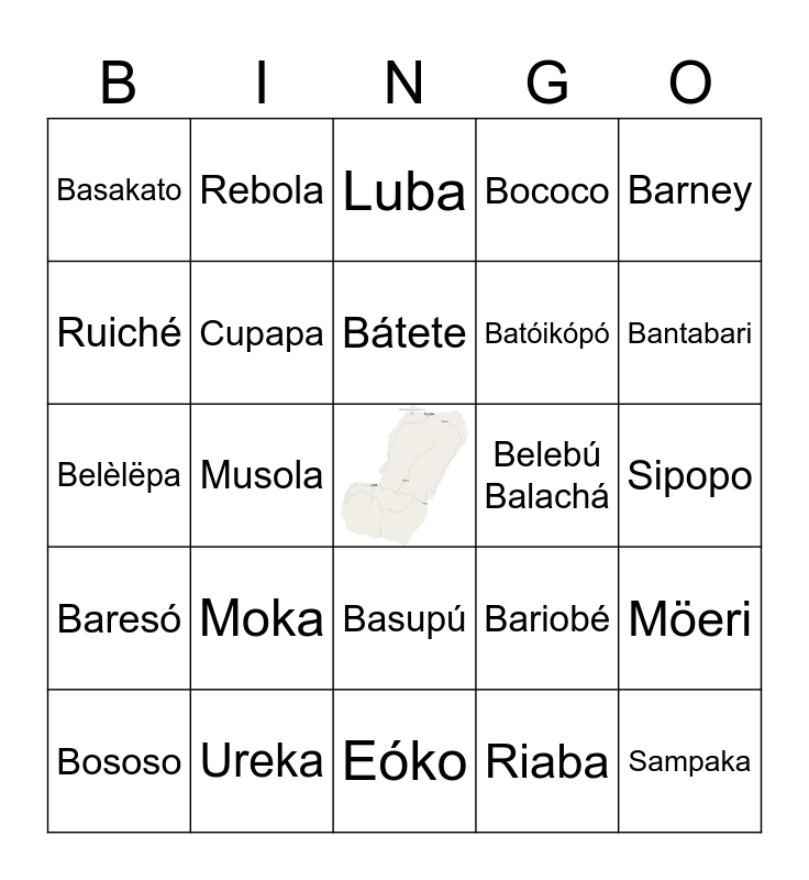 This bingo card has a free space and 24 words: Moka, Ureka, Bátete, Bososo, Barney, Basakato, Ruiché, Rebola, Belebú Balachá, Basupú, Batóikópó, Belèlëpa, Bariobé, Möeri, Cupapa, Riaba, Sipopo, Luba, Bantabari, Musola, Sampaka, Baresó, Bococo and Eóko.