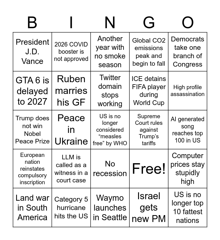 This bingo card has 25 words: LLM is called as a witness in a court case, Waymo launches in Seattle, Twitter domain stops working, Land war in South America, Democrats take one branch of Congress, President J.D. Vance, GTA 6 is delayed to 2027, 2026 COVID booster is not approved, Supreme Court rules against Trump’s tariffs, No recession, ICE detains FIFA player during World Cup, Trump does not win Nobel Peace Prize, Free!, Computer prices stay stupidly high, Ruben marries his GF, US is no longer top 10 fattest nations, AI generated song reaches top 100 in US, Another year with no smoke season, High profile assassination, Peace in Ukraine, US is no longer considered “measles free” by WHO, Category 5 hurricane hits the US, European nation reinstates compulsory inscription, Global CO2 emissions peak and begin to fall and Israel gets new PM.